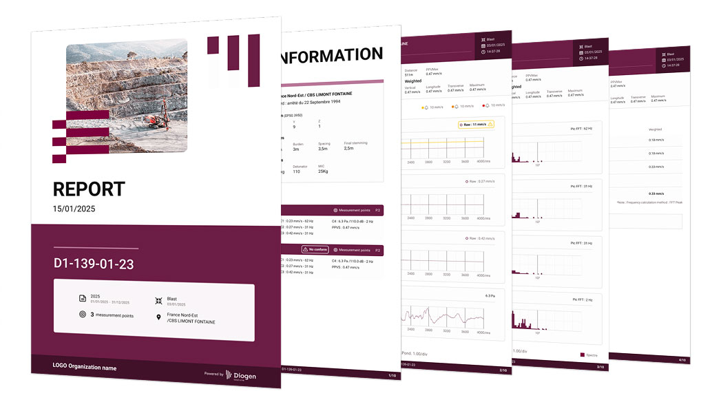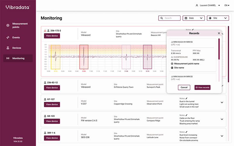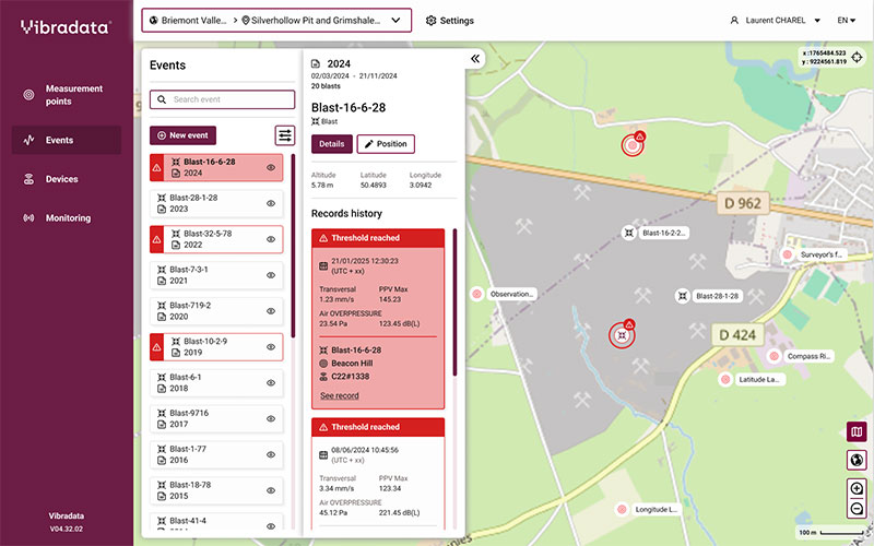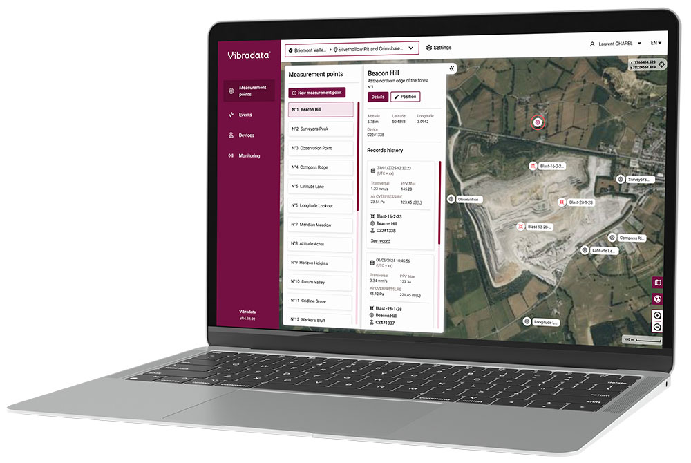 VIBRADATA© is an online platform developed by EPC Groupe dedicated to seismometer management. It allows data from vibration sensors to be centralized and analyzed in order to verify regulatory compliance of operations.