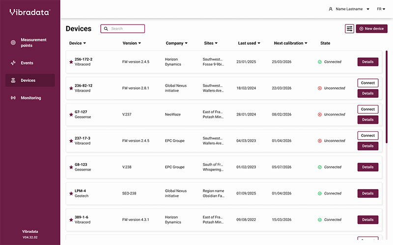 VIBRADATA© allows you to view and manage all equipment deployed in the field, whether connected in real time or configured in standalone mode. The platform provides accurate tracking of their positions, operational statuses, and technical parameters directly from the map.